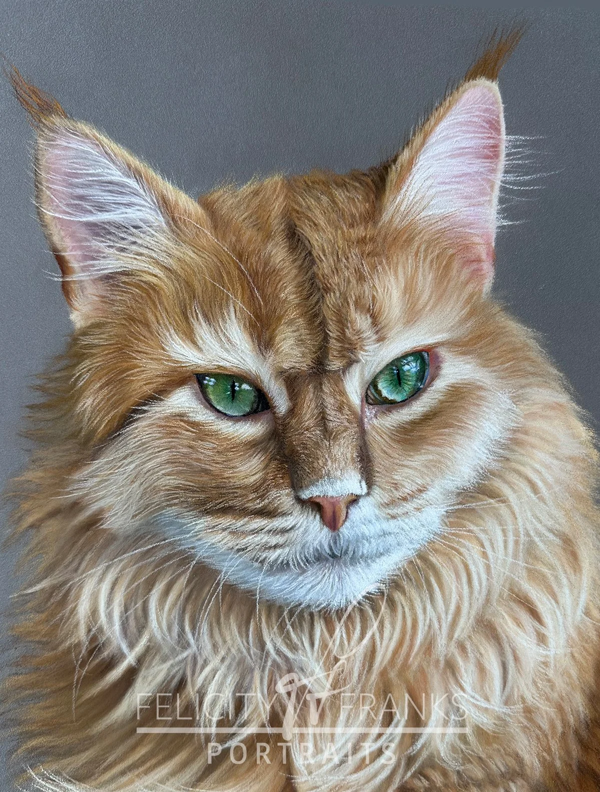 Learn how to draw a realistic Maine Coon cat in soft pastels. This tutorial is just under 10 hours long and packed with helpful information including how to tackle a low quality sheet of Pastelmat (such as this one). In this three part tutorial I show you how to put in your base layers and fine details to create a realistic cat portrait. includes reference photo, line art and real time voice over.